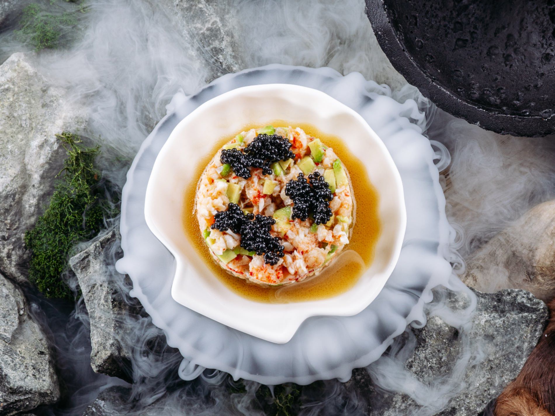 Раковые шейки, авокадо, икра палтуса, подается с пряно - цитрусовым соусом, хрустящим багетом, украшенный микрозеленью. на 1 порцию: Кк 95, Ж 5, Б 2, У 10